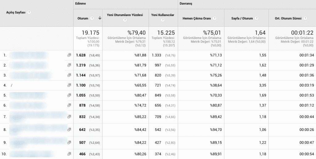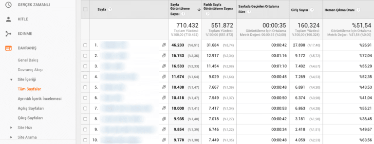 Sonrasında yüksek trafik gelen sayfalarınızın hemen çıkma oranlarını inceleyin. İyi performans göstermeyen yüksek trafikli sayfalarınızı bulduğunuz zaman bu sayfaları optimize etmeye başlayabilirsiniz.