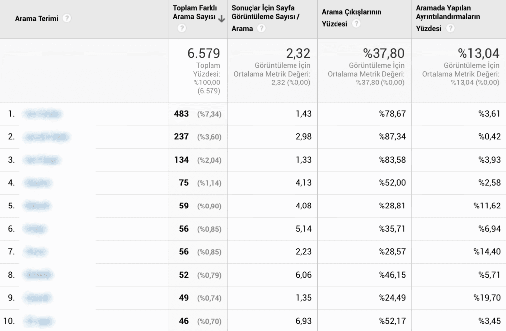 Peki arama barından yapılan arama sorgularına Analytics üzerinden nasıl ulaşabilirsiniz? Bunun için Davranış > Site Arama > Arama Terimleri yolunu izleyebilirsiniz.