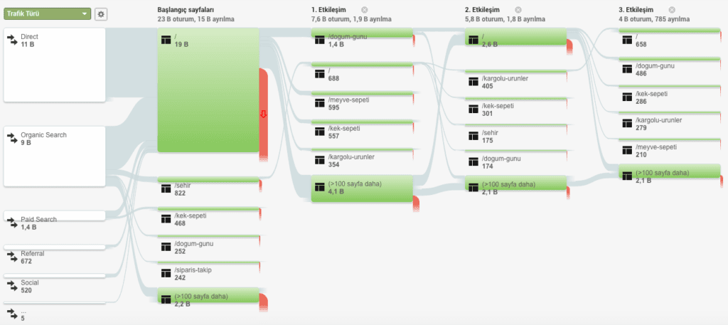Her aşamada kullanıcı sorununun ne olduğunu ve buna ne gibi bir çözüm bulacağını daha iyi anlar. Google Analytics’te Davranış > Davranış Akışı yolunu takip ederek kullanıcıların satın alma adımlarını inceleyebilirsiniz.
