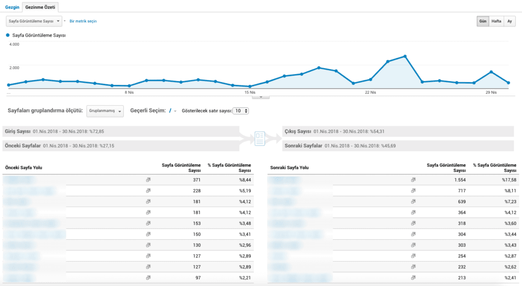 Google Analytics Gezinme Özeti sekmesinden sitenizi ziyaret edenlerin hangi yolu takip ederek geldiklerini ve sonra hangi sayfaları ziyaret ettiklerini inceleyebilirsiniz.